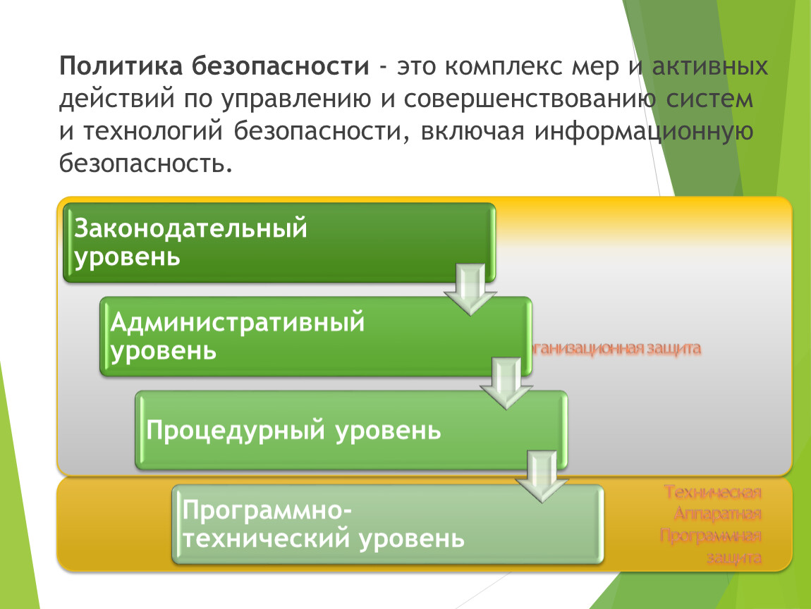 Политика безопасности - это комплекс мер и активных действий по управлению и совершенствованию систем и технологий безопасности, включая информационную безопасность.