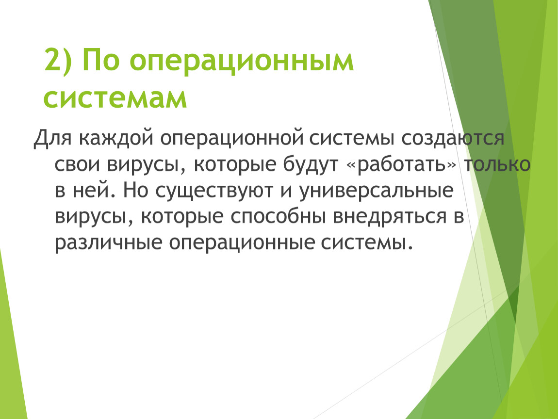 Для каждой операционной системы создаются свои вирусы, которые будут «работать» только в ней. Но существуют и универсальные вирусы, которые способны внедряться в различные операционные системы.