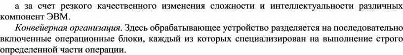 Конвейерная организация. Здесь обрабатывающее устройство разделяется на последовательно включенные операционные блоки, каждый из которых специализирован на выполнение строго определенной части операции.