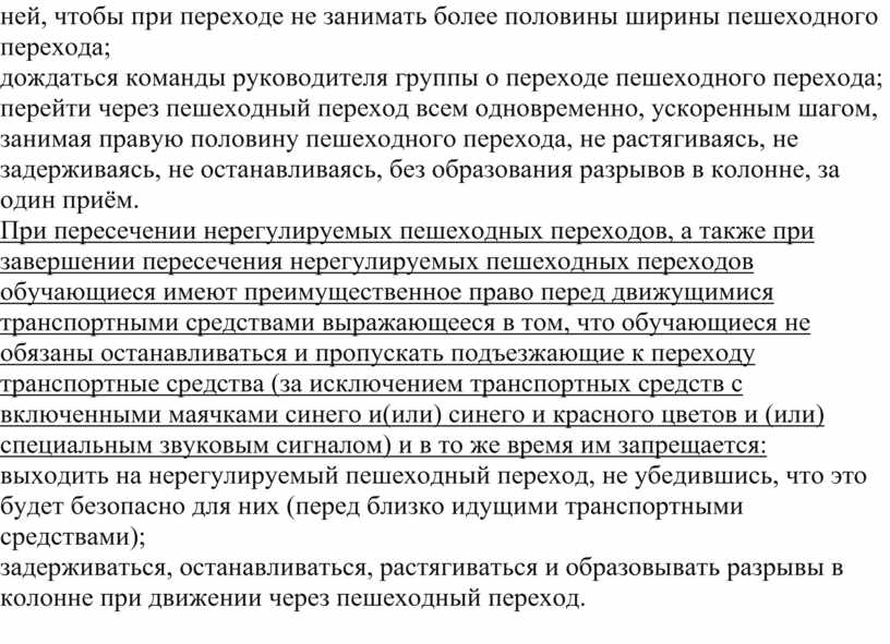При пересечении нерегулируемых пешеходных переходов, а также при завершении пересечения нерегулируемых пешеходных переходов обучающиеся имеют преимущественное право перед движущимися транспортными средствами выражающееся в том, что обучающиеся не обязаны останавливаться и пропускать подъезжающие к переходу транспортные средства (за исключением транспортных средств с включенными маячками синего и(или) синего и красного цветов и (или) специальным звуковым сигналом) и в то же время им запрещается: