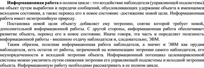 Информационная работа в полном цикле - это воздействие наблюдателя (управляющей подсистемы) на объект путем выработки и передачи сообщений, обусловливающих удержание объекта в имеющемся исходном состоянии, а также перевод его в новое состояние -достижение новой цели. Информационная работа имеет неэнтропийную природу.