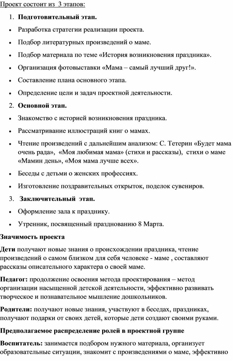 Воспитатель: занимается подбором нужного материала, организует образовательные ситуации, знакомит с произведениями о маме, эффективно развивает творческое и познавательное мышление дошкольников и мелкую моторику рук.