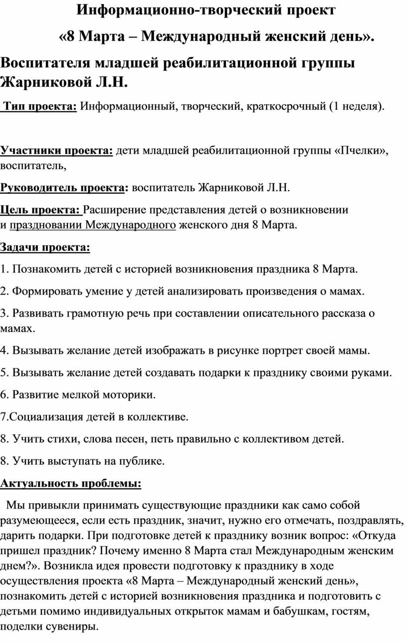 Мы привыкли принимать существующие праздники как само собой разумеющееся, если есть праздник, значит, нужно его отмечать, поздравлять, дарить подарки. При подготовке детей к празднику возник вопрос: «Откуда пришел праздник? Почему именно 8 Марта стал Международным женским днем?». Возникла идея провести подготовку к празднику в ходе осуществления проекта «8 Марта – Международный женский день», познакомить детей с историей возникновения праздника и подготовить с детьми помимо индивидуальных открыток мамам и бабушкам, гостям, поделки сувениры.