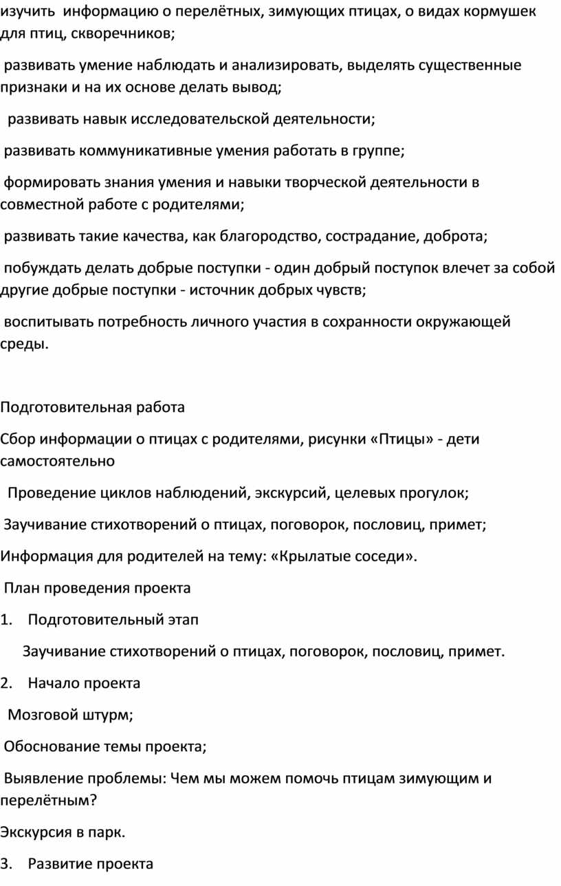 Проект направлен на расширение знаний учащихся о птицах, их образе жизни, строении. Проект поможет детям ответить на основополагающий вопрос «Как живут наши птицы»? Учащиеся в ходе проекта смогут в ходе наблюдения и анализа узнать строение птиц, особенности их питания и образ жизни. В ходе проекта учащиеся смогут сделать вывод: чем отличаются перелётные птицы от зимующих ? Также ответят на вопрос «Чем мы можем помочь нашим птицам?» Младшим школьникам необходимо понять роль человека в жизни животных. Результатом проекта будет выставка рисунков «Ждём пернатых гостей!"», презентация «День птиц», проведение совместной с родителями акции «Моя кормушка птицам», «Скворечники»