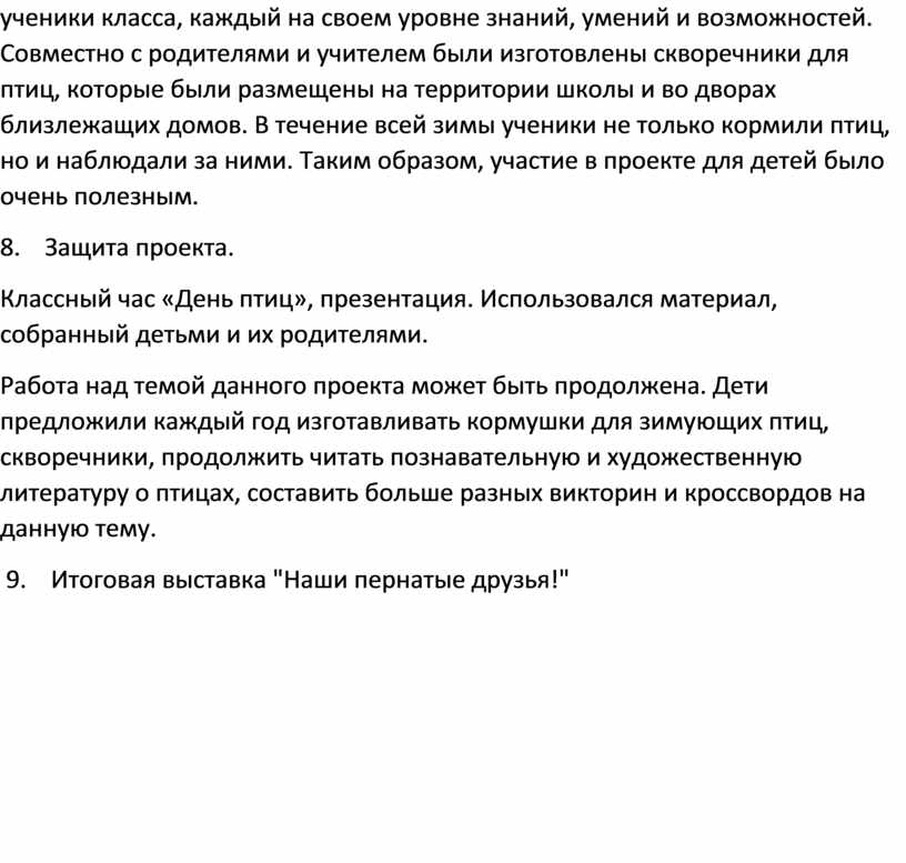 В ходе работы над проектом были использованы различные источники информации: учебники, справочники, энциклопедии (в том числе электронные), методические рекомендации. Активно использовались компьютерные, цифровые технологии: при подготовке сообщений, презентации. В осуществлении проекта приняли участие родители и все ученики класса, каждый на своем уровне знаний, умений и возможностей. Совместно с родителями и учителем были изготовлены скворечники для птиц, которые были размещены на территории школы и во дворах близлежащих домов. В течение всей зимы ученики не только кормили птиц, но и наблюдали за ними. Таким образом, участие в проекте для детей было очень полезным.