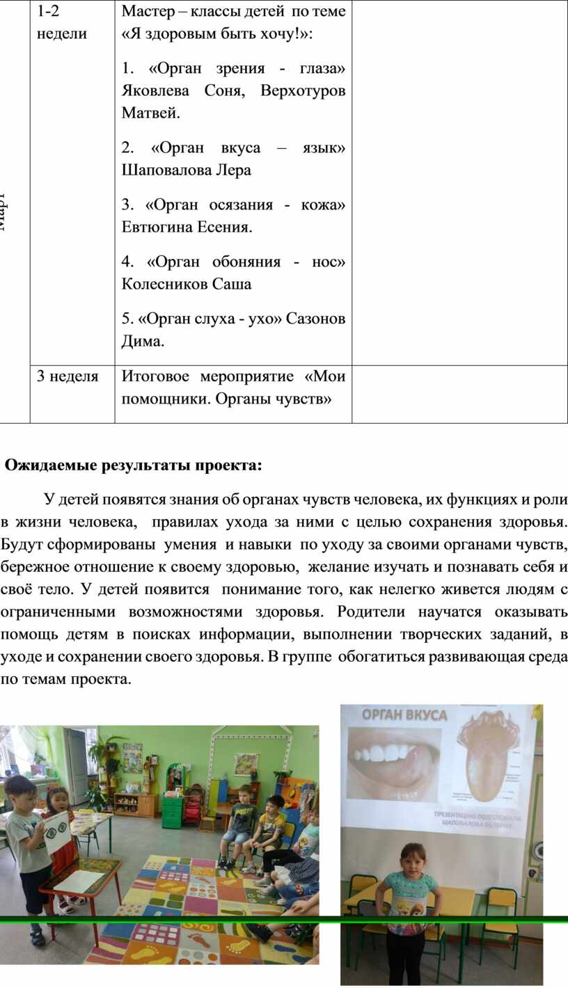 У детей появятся знания об органах чувств человека, их функциях и роли в жизни человека, правилах ухода за ними с целью сохранения здоровья. Будут сформированы умения и навыки по уходу за своими органами чувств, бережное отношение к своему здоровью, желание изучать и познавать себя и своё тело. У детей появится понимание того, как нелегко живется людям с ограниченными возможностями здоровья. Родители научатся оказывать помощь детям в поисках информации, выполнении творческих заданий, в уходе и сохранении своего здоровья. В группе обогатиться развивающая среда по темам проекта.
