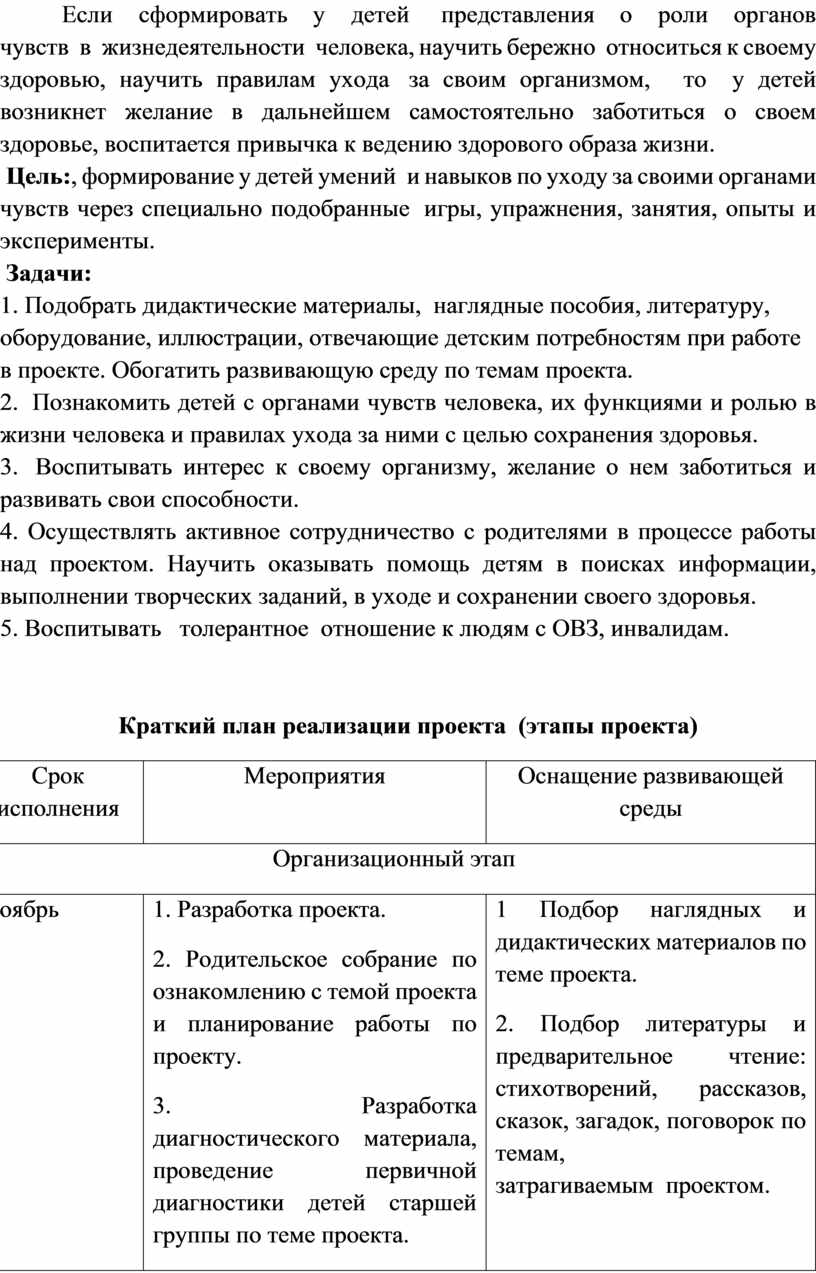 Проблема: В дошкольном возрасте проявляется интерес детей к познанию своего организма. Ребенок должен получать элементарные представления о своем организме, о работе органов чувств, т.к. через познание себя он может бережно относиться к своему организму. В нашей группе возникла проблема: частые кровотечения из носа, плохое состояние зубов у некоторых ребят. Мы решили заняться решением данной проблемы через погружение детей в исследовательскую деятельность своего организма и, в частности, изучением и ознакомлением со своими органами чувств, приучению к заботе и уходу за ними. Зная значение и функции органов чувств, можно, применив в работе с детьми специально подобранные игры, упражнения и занятия, научить детей их эффективно развивать и бережно к ним относиться.