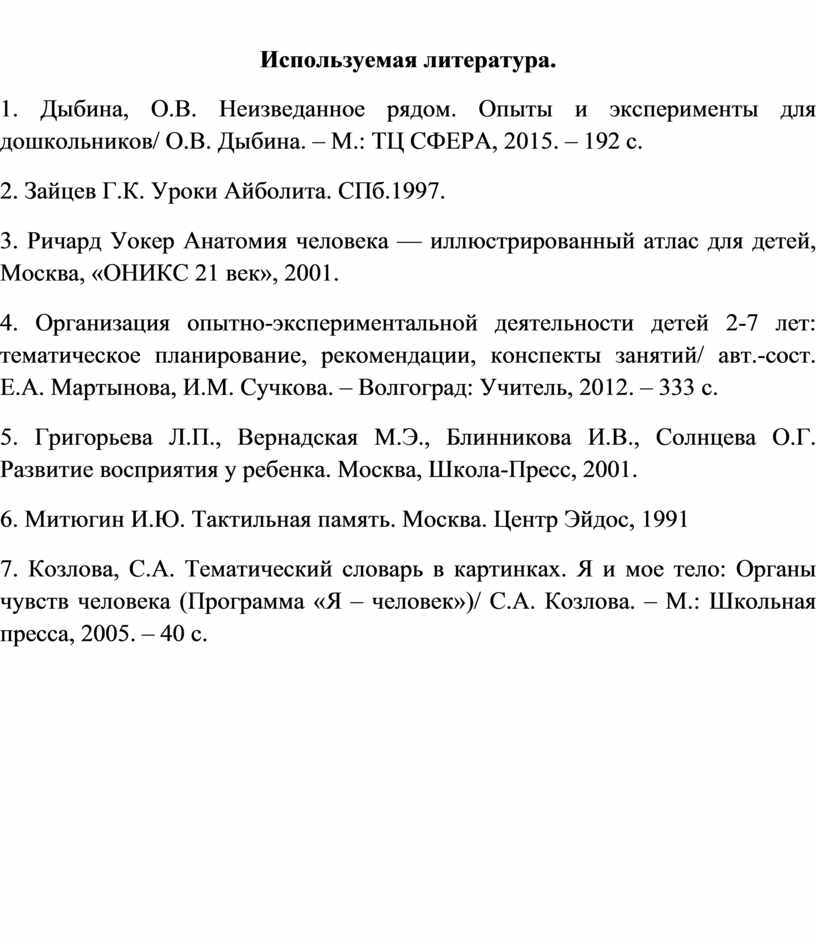1. Дыбина, О.В. Неизведанное рядом. Опыты и эксперименты для дошкольников/ О.В. Дыбина. – М.: ТЦ СФЕРА, 2015. – 192 с.