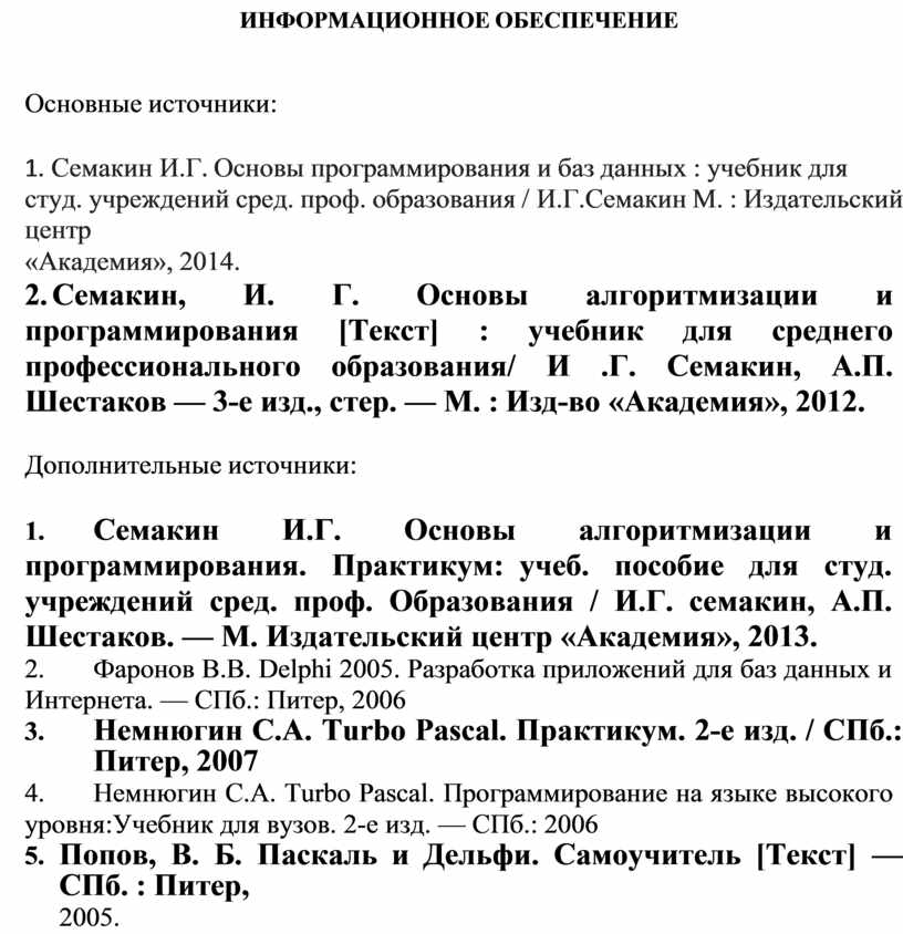 1. Семакин И.Г. Основы программирования и баз данных : учебник для