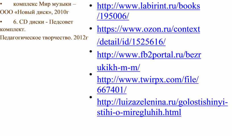 http://www.labirint.ru/books /195006/ https://www.ozon.ru/context /detail/id/1525616/ http://www.fb2portal.ru/bezr ukikh-m-m/ http://www.twirpx.com/file/ 667401/ http://luizazelenina.ru/golostishinyi-stihi-o-miregluhih.html |