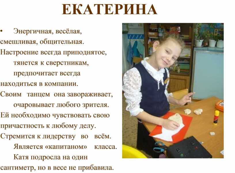 Своим танцем она завораживает, очаровывает любого зрителя. Ей необходимо чувствовать свою причастность к любому делу. Стремится к лидерству во всём. Является «капитаном» класса. Катя подросла на один сантиметр, но в весе не прибавила.
