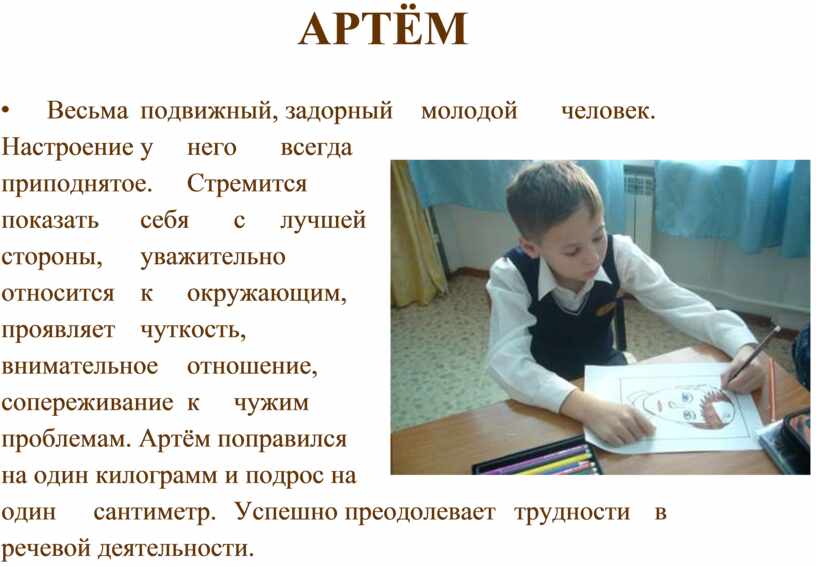 сочетанием форм и цвета. Любит животных и маленьких детей. Мальчик открыт и