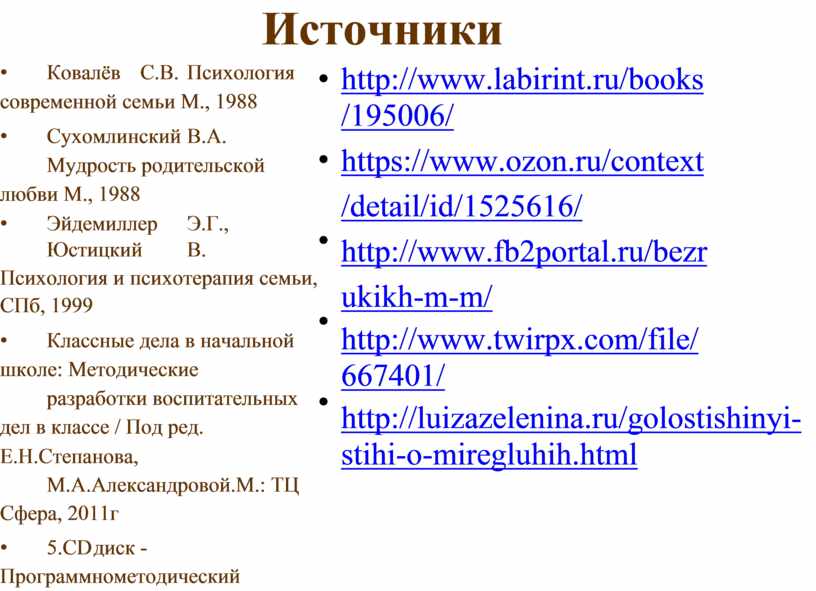 • Ковалёв С.В. Психология современной семьи М., 1988 • Сухомлинский В.А. Мудрость родительской любви М., 1988 • Эйдемиллер Э.Г., Юстицкий В. Психология и психотерапия семьи, СПб, 1999 • Классные дела в начальной школе: Методические разработки воспитательных дел в классе / Под ред. Е.Н.Степанова, М.А.Александровой.М.: ТЦ Сфера, 2011г • 5.СD диск -Программнометодический комплекс Мир музыки – ООО «Новый диск», 2010г • 6. СD диски - Педсовет комплект. Педагогическое творчество. 2012г |