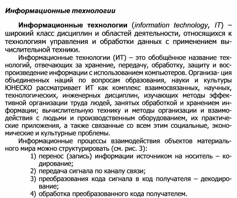 Информационные технологии (ИТ) – это обобщённое название тех- нологий, отвечающих за хранение, передачу, обработку, защиту и вос- произведение информации с использованием компьютеров. Организа- ция объединенных наций по вопросам образования, науки и культуры ЮНЕСКО рассматривает ИТ как комплекс взаимосвязанных, научных, технологических, инженерных дисциплин, изучающих методы эффек- тивной организации труда людей, занятых обработкой и хранением ин- формации; вычислительную технику и методы организации и взаимо- действия с людьми и производственным оборудованием, их практиче- ские приложения, а также связанные со всем этим социальные, эконо- мические и культурные проблемы.