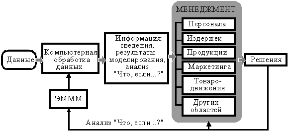 На схеме рис. 31 показаны информационные потоки взаимодействия менеджера и компьютерной системы DSS, что обычно называется анализом «что, если .... ?» Компьютер генерирует результаты на экономико-математической модели, а менеджер его спрашивает: «Что произойдет, если что-нибудь изменится в модели?» (например, цены, издержки, их структура и т.д.). Менеджер может также промоделировать возможные решения и оценить потенциальные результаты.