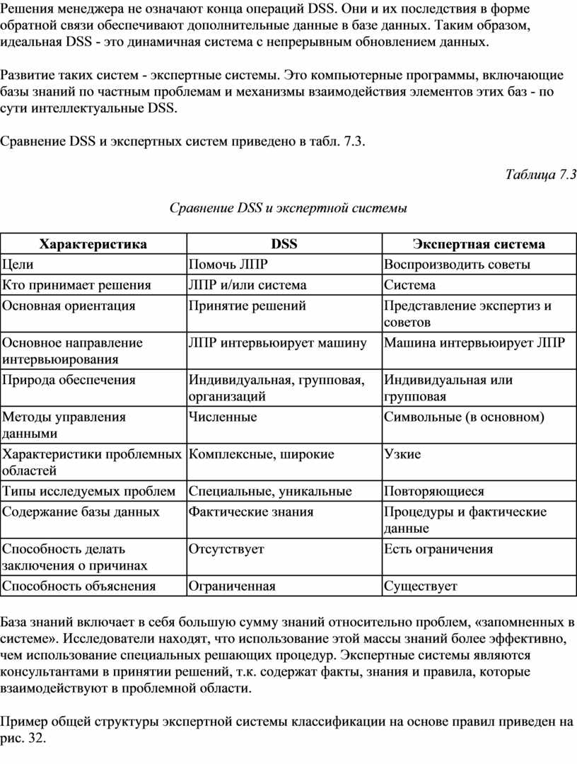 Сравнение DSS и экспертных систем приведено в табл. 7.3.