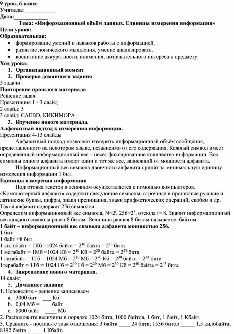 Тема: «Информационный объём данных. Единицы измерения информации»