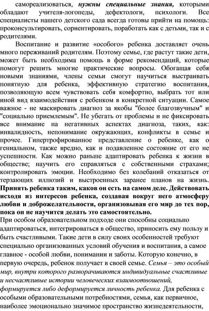 При особом образовательном подходе они способны социально адаптироваться, интегрироваться в общество, приносить ему пользу и быть счастливыми. Такие дети в силу своих особенностей требуют специально организованных условий обучения и воспитания, а самое главное - особой любви, понимании и заботы. Которую конечно, в первую очередь, ребенок получает в своей семье. Семья – это особый мир, внутри которого разворачиваются индивидуальные счастливые и несчастливые истории человеческих взаимоотношений, формируется либо деформируется личность ребенка. Для ребенка с особыми образовательными потребностями, семья, как первичное, наиболее эмоционально значимое пространство жизнедеятельности, должна выполнять свое базовое предназначение – стать для него своеобразной коррекционно-развивающей средой. Включаясь в такую среду, ребенок с особыми образовательными потребностями учится возмещать свои природные недостатки, обретает возможность справиться с возрастными задачами иными путями. И наша наиважнейшая задача как родителей – это поддерживать, любить и принимать его таким какой он есть, ведь он НАШ.