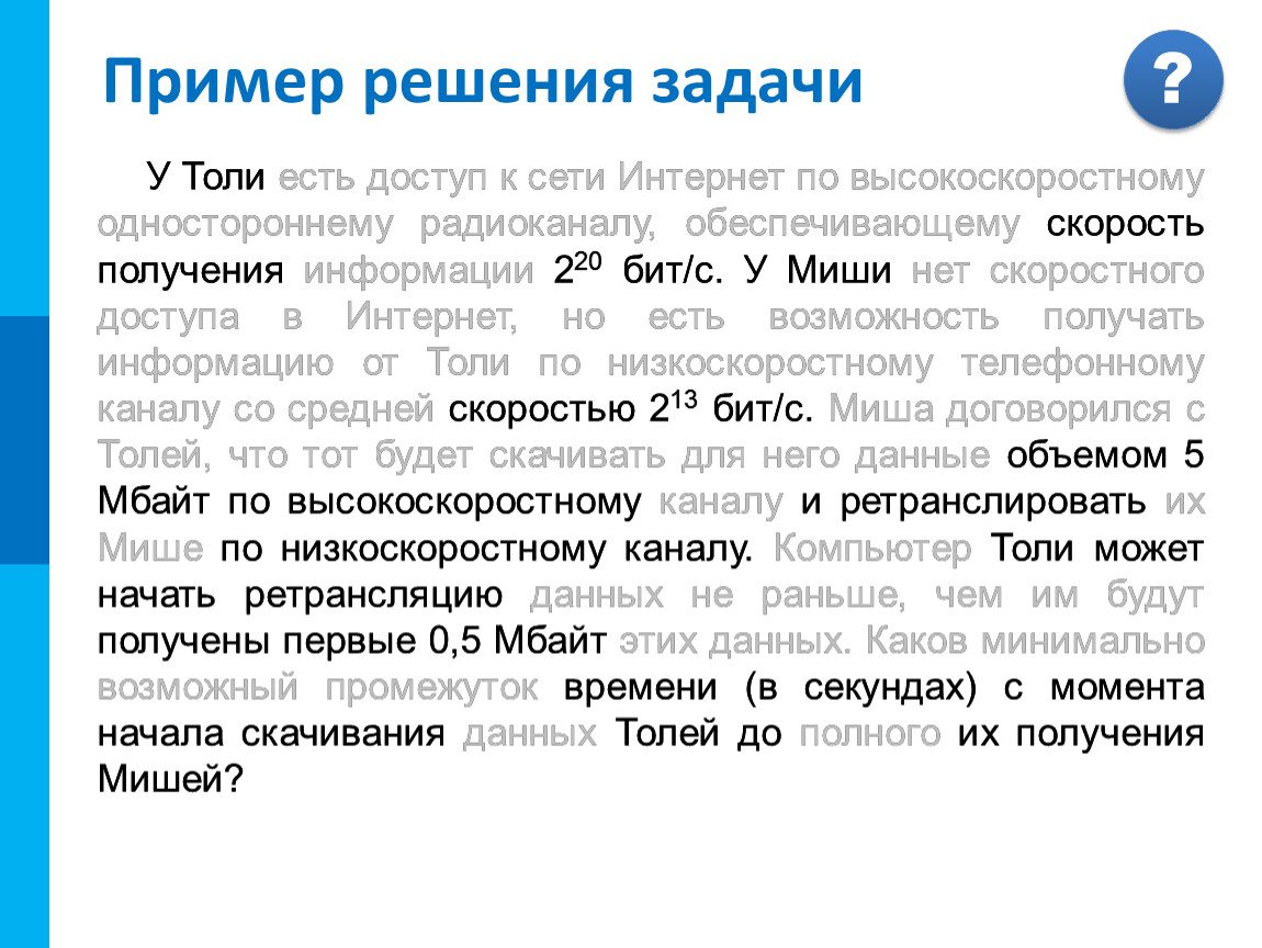 У Толи есть доступ к сети Интернет по высокоскоростному одностороннему радиоканалу, обеспечивающему скорость получения информации 220 бит/с. У Миши нет скоростного доступа в Интернет, но есть возможность получать информацию от Толи по низкоскоростному телефонному каналу со средней скоростью 213 бит/с. Миша договорился с Толей, что тот будет скачивать для него данные объемом 5 Мбайт по высокоскоростному каналу и ретранслировать их Мише по низкоскоростному каналу. Компьютер Толи может начать ретрансляцию данных не раньше, чем им будут получены первые 0,5 Мбайт этих данных. Каков минимально возможный промежуток времени (в секундах) с момента начала скачивания данных Толей до полного их получения Мишей?