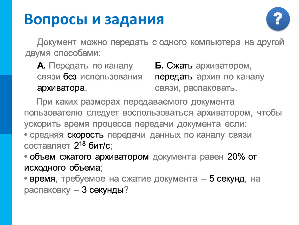 А. Передать по каналу связи без использования архиватора. | Б. Сжать архиватором, передать архив по каналу связи, распаковать. |