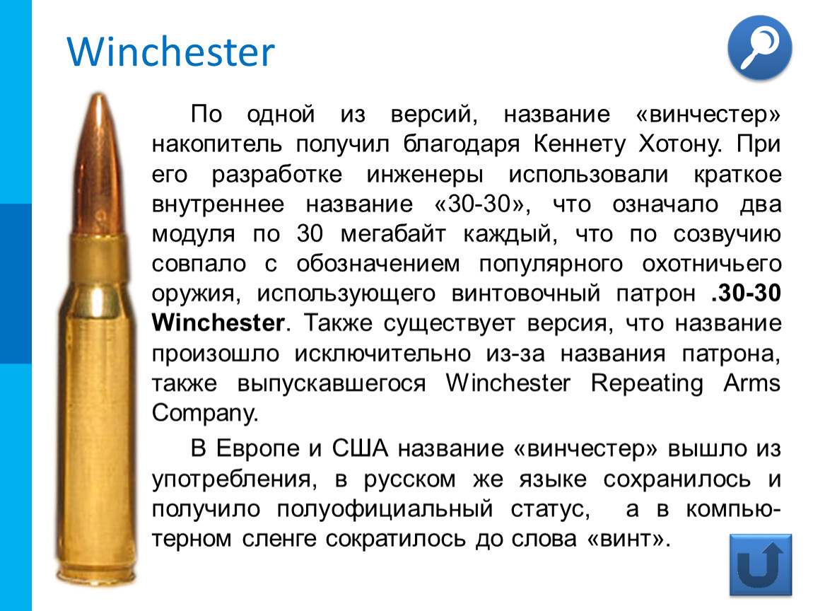 В Европе и США название «винчестер» вышло из употребления, в русском же языке сохранилось и получило полуофициальный статус, а в компью-терном сленге сократилось до слова «винт».