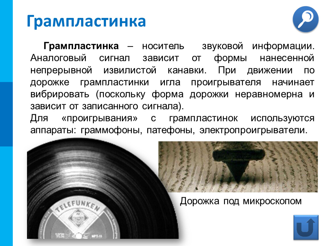 Грампластинка – носитель звуковой информации. Аналоговый сигнал зависит от формы нанесенной непрерывной извилистой канавки. При движении по дорожке грампластинки игла проигрывателя начинает вибрировать (поскольку форма дорожки неравномерна и зависит от записанного сигнала).