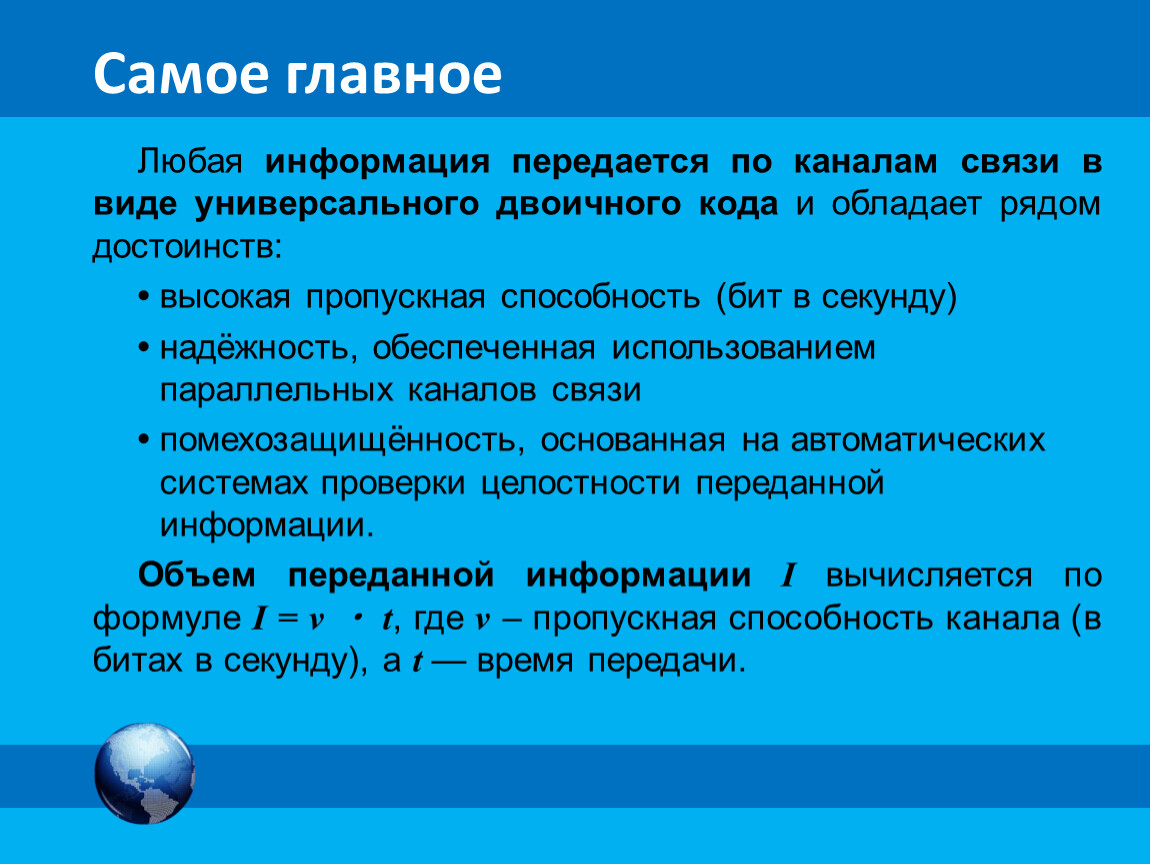 Любая информация передается по каналам связи в виде универсального двоичного кода и обладает рядом достоинств: