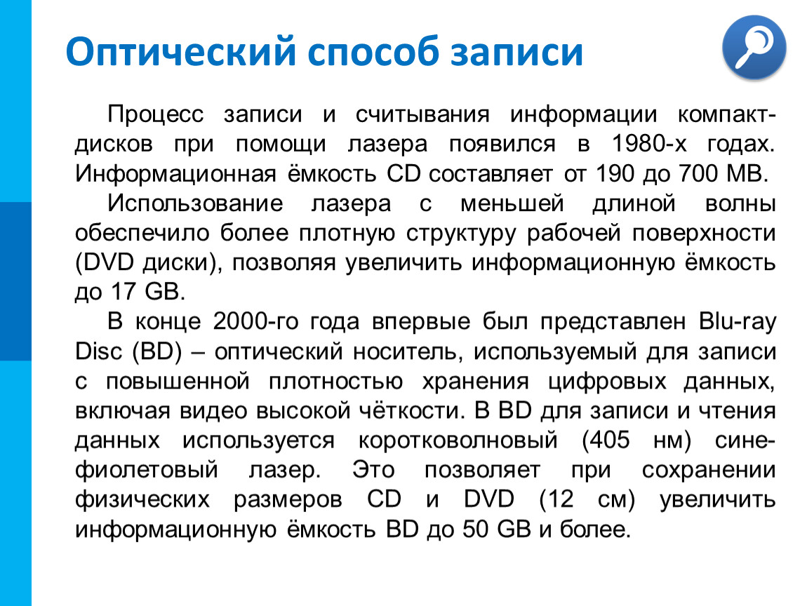 В конце 2000-го года впервые был представлен Blu-ray Disc (BD) – оптический носитель, используемый для записи с повышенной плотностью хранения цифровых данных, включая видео высокой чёткости. В BD для записи и чтения данных используется коротковолновый (405 нм) сине-фиолетовый лазер. Это позволяет при сохранении физических размеров CD и DVD (12 см) увеличить информационную ёмкость BD до 50 GB и более.