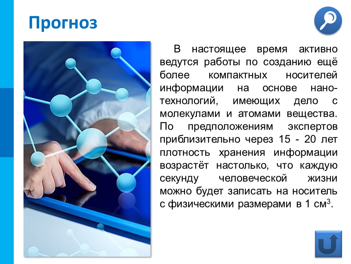 В настоящее время активно ведутся работы по созданию ещё более компактных носителей информации на основе нано-технологий, имеющих дело с молекулами и атомами вещества. По предположениям экспертов приблизительно через 15 - 20 лет плотность хранения информации возрастёт настолько, что каждую секунду человеческой жизни можно будет записать на носитель с физическими размерами в 1 см3.