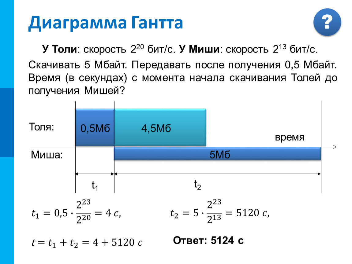 Скачивать 5 Мбайт. Передавать после получения 0,5 Мбайт. Время (в секундах) с момента начала скачивания Толей до получения Мишей?