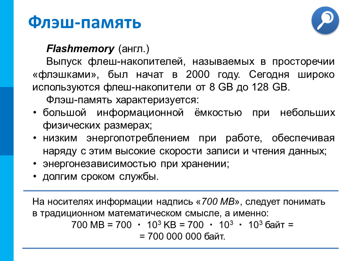 Выпуск флеш-накопителей, называемых в просторечии «флэшками», был начат в 2000 году. Сегодня широко используются флеш-накопители от 8 GB до 128 GB.