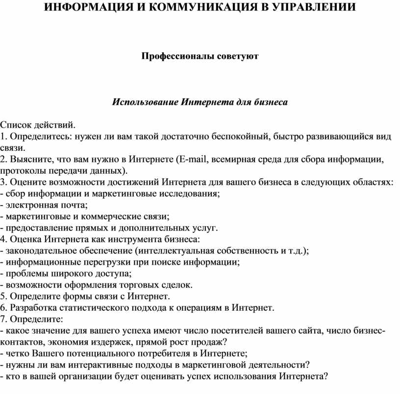 - кто в вашей организации будет оценивать успех использования Интернета?
