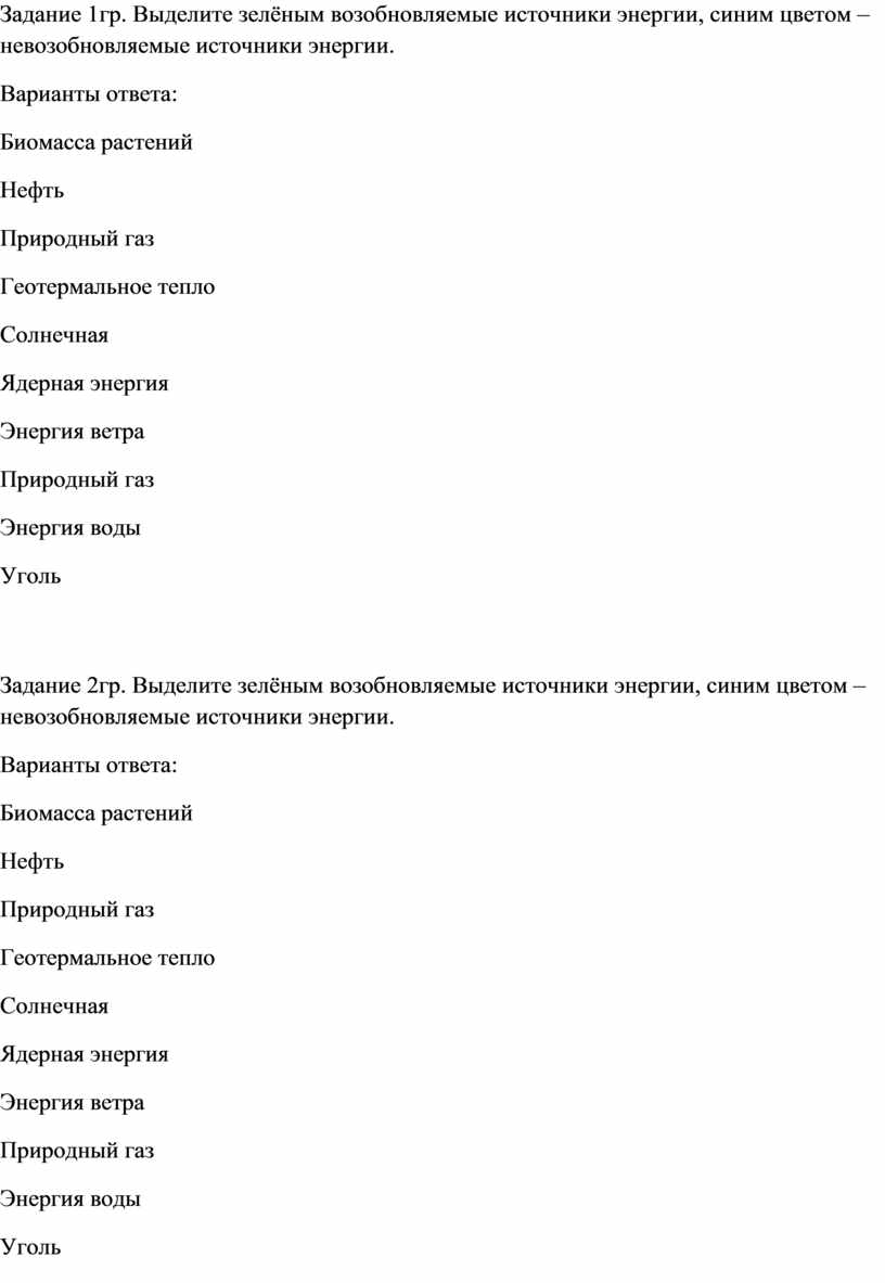 Задание 1гр. Выделите зелёным возобновляемые источники энергии, синим цветом – невозобновляемые источники энергии.