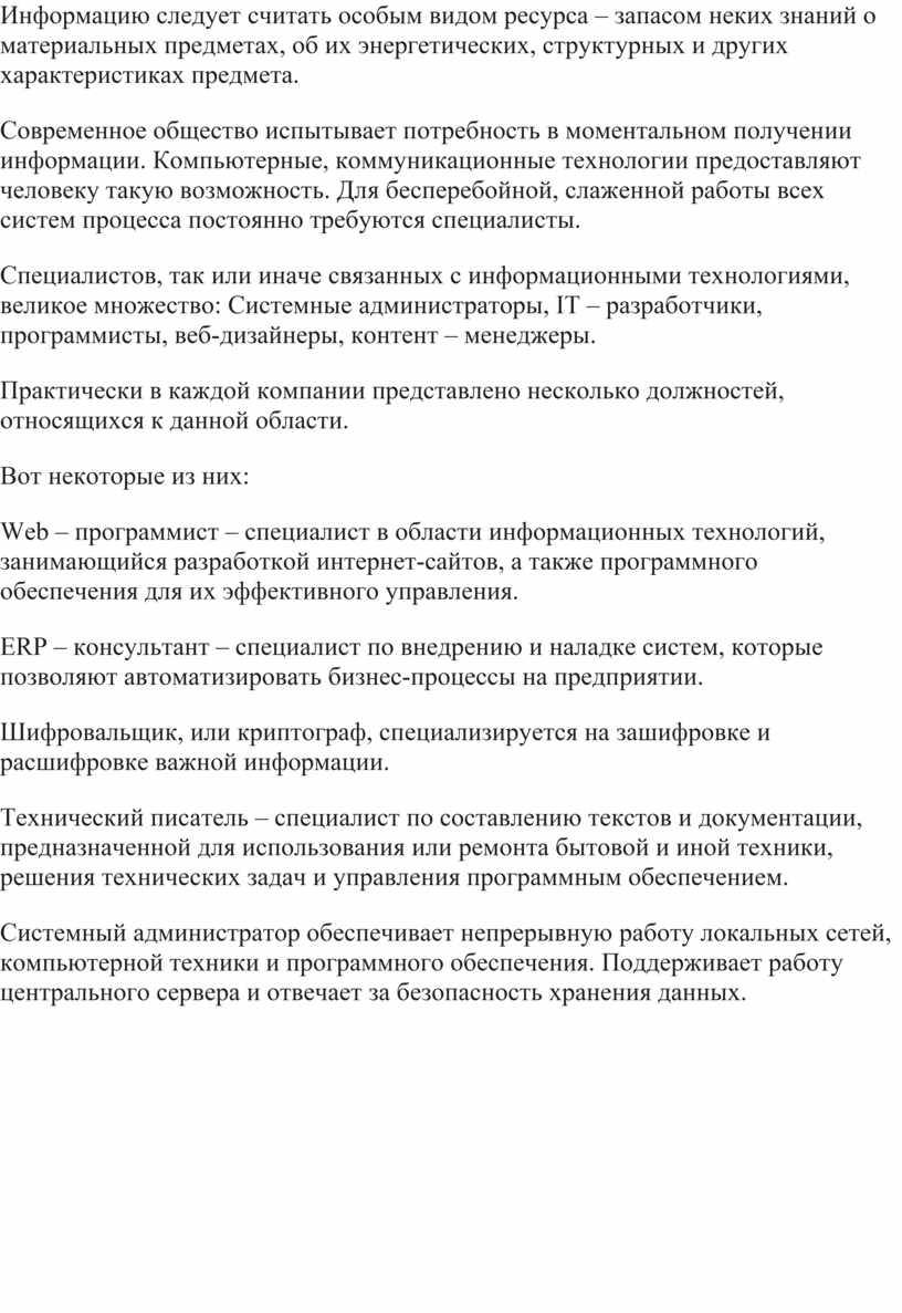 Специалистов, так или иначе связанных с информационными технологиями, великое множество: Системные администраторы, IT – разработчики, программисты, веб-дизайнеры, контент – менеджеры.