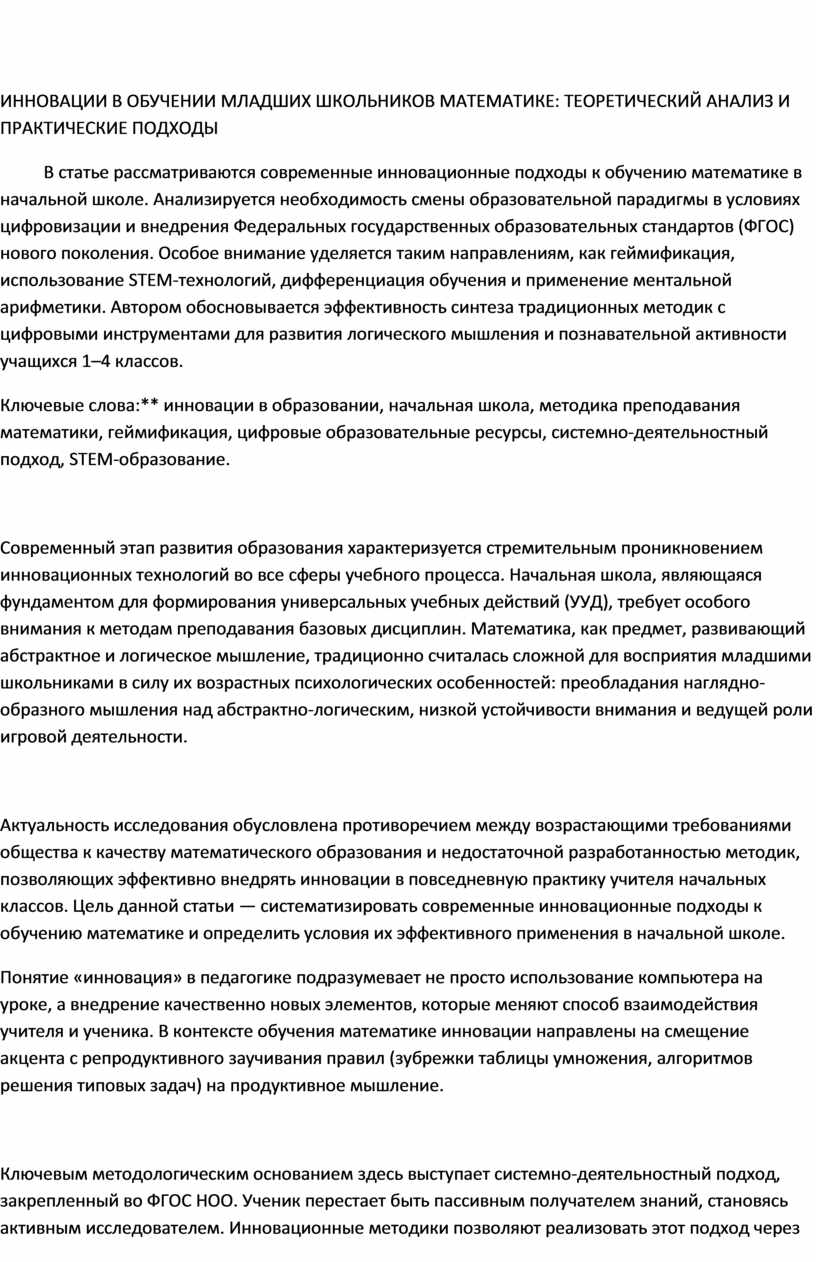 Актуальность исследования обусловлена противоречием между возрастающими требованиями общества к качеству математического образования и недостаточной разработанностью методик, позволяющих эффективно внедрять инновации в повседневную практику учителя начальных классов. Цель данной статьи — систематизировать современные инновационные подходы к обучению математике и определить условия их эффективного применения в начальной школе.