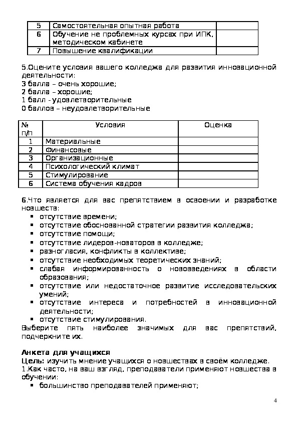 5.Оцените условия вашего колледжа для развития инновационной