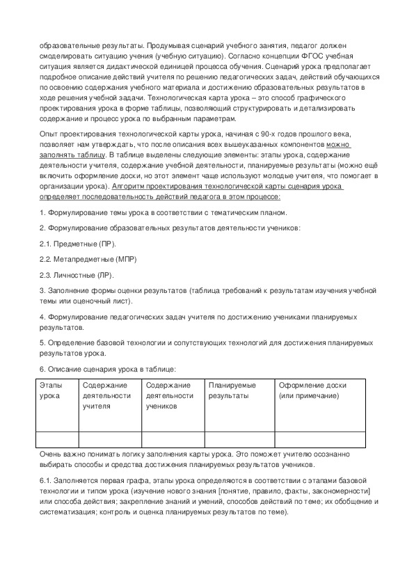 организации урока). Алгоритм проектирования технологической карты сценария урока