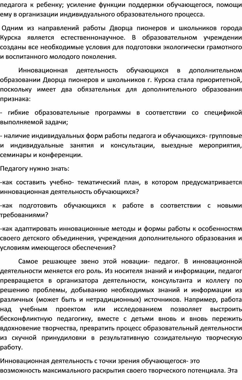 Инновационная деятельность обучающихся в дополнительном образовании Дворца пионеров и школьников г. Курска стала приоритетной, поскольку имеет два обязательных для дополнительного образования признака: