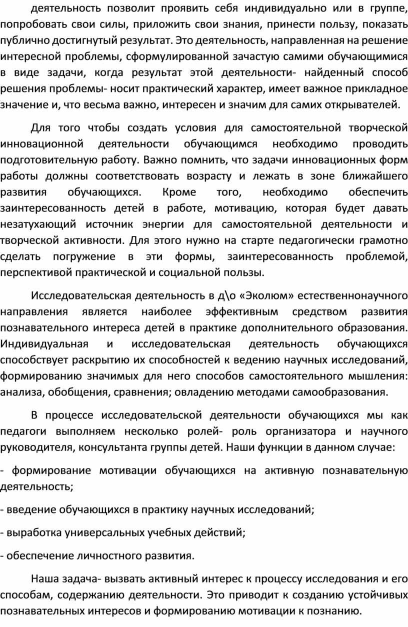 Исследовательская деятельность в д\о «Эколюм» естественнонаучного направления является наиболее эффективным средством развития познавательного интереса детей в практике дополнительного образования. Индивидуальная и исследовательская деятельность обучающихся способствует раскрытию их способностей к ведению научных исследований, формированию значимых для него способов самостоятельного мышления: анализа, обобщения, сравнения; овладению методами самообразования.