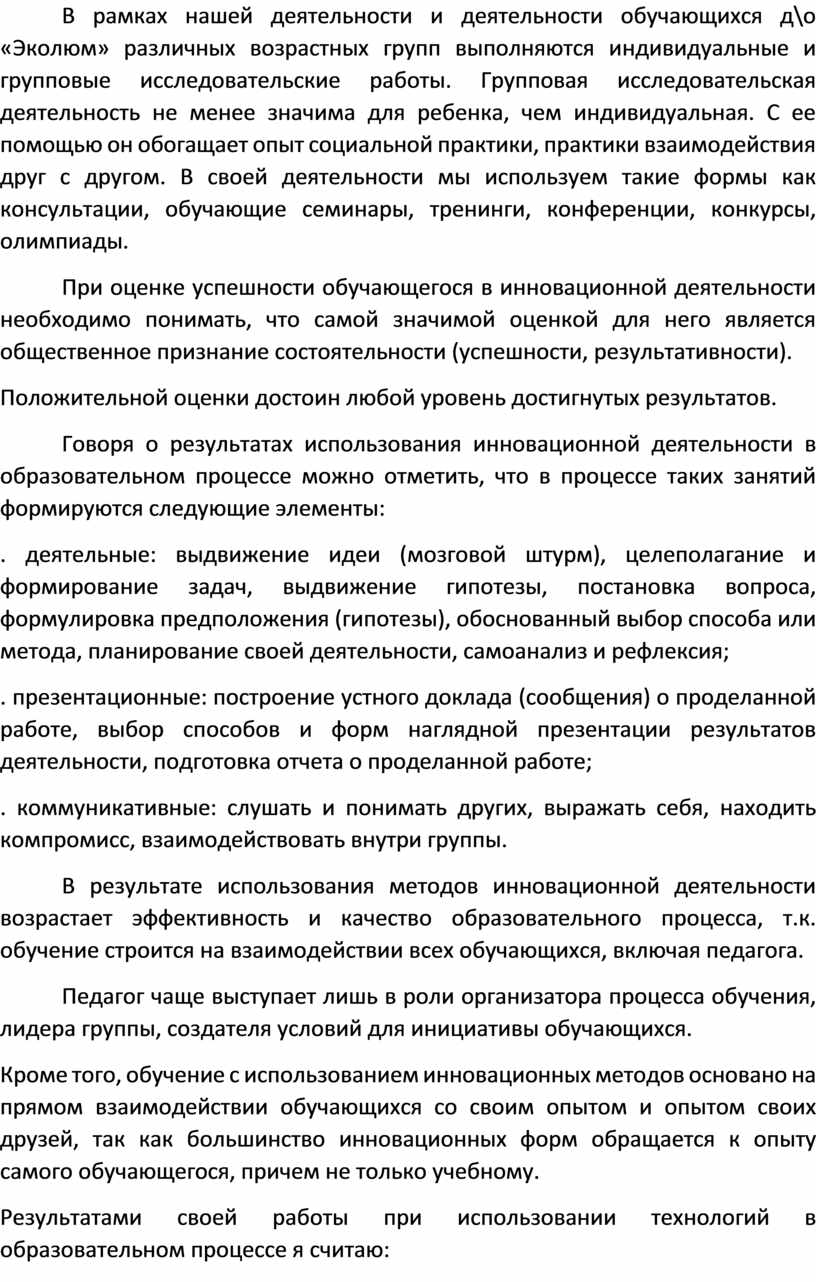 В результате использования методов инновационной деятельности возрастает эффективность и качество образовательного процесса, т.к. обучение строится на взаимодействии всех обучающихся, включая педагога.