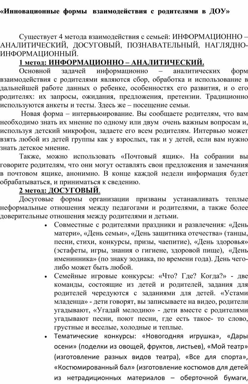 Существует 4 метода взаимодействия с семьей: ИНФОРМАЦИОННО – АНАЛИТИЧЕСКИЙ, ДОСУГОВЫЙ, ПОЗНАВАТЕЛЬНЫЙ, НАГЛЯДНО-ИНФОРМАЦИОННЫЙ.