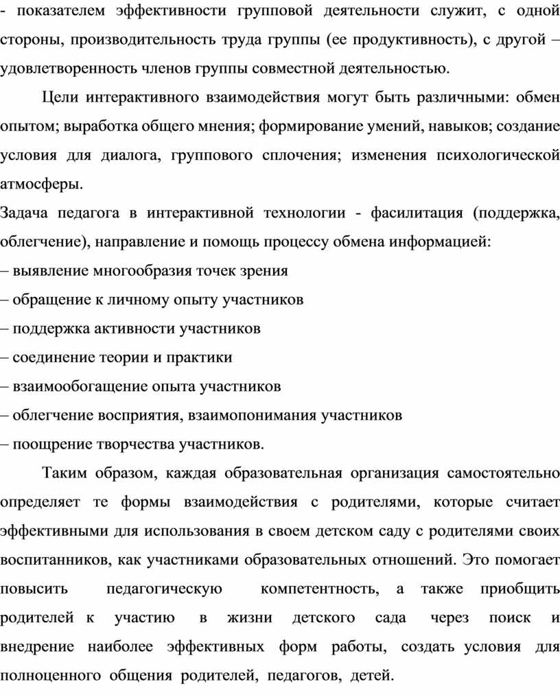 Таким образом, каждая образовательная организация самостоятельно определяет те формы взаимодействия с родителями, которые считает эффективными для использования в своем детском саду с родителями своих воспитанников, как участниками образовательных отношений. Это помогает повысить педагогическую компетентность, а также приобщить родителей к участию в жизни детского сада через поиск и внедрение наиболее эффективных форм работы, создать условия для полноценного общения родителей, педагогов, детей.