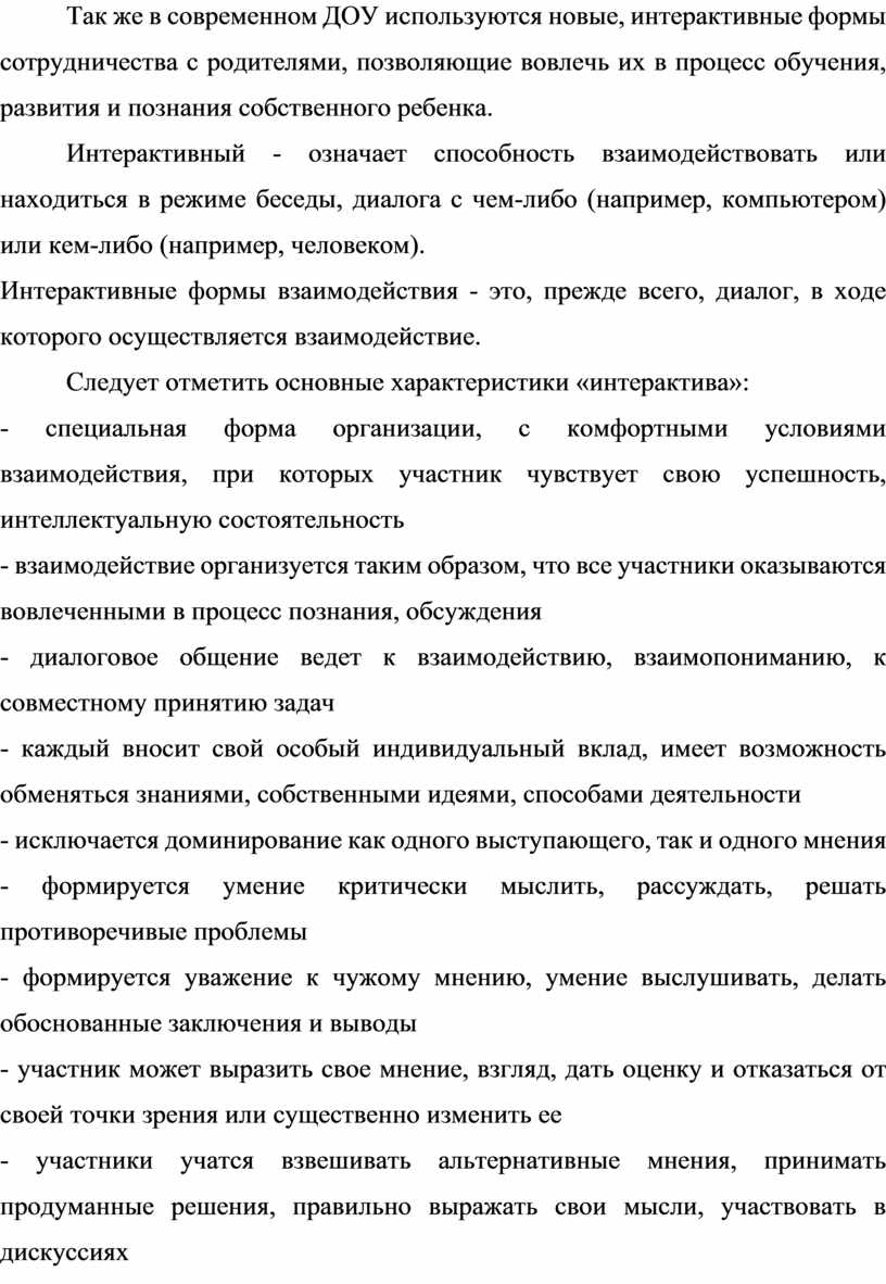 Так же в современном ДОУ используются новые, интерактивные формы сотрудничества с родителями, позволяющие вовлечь их в процесс обучения, развития и познания собственного ребенка.