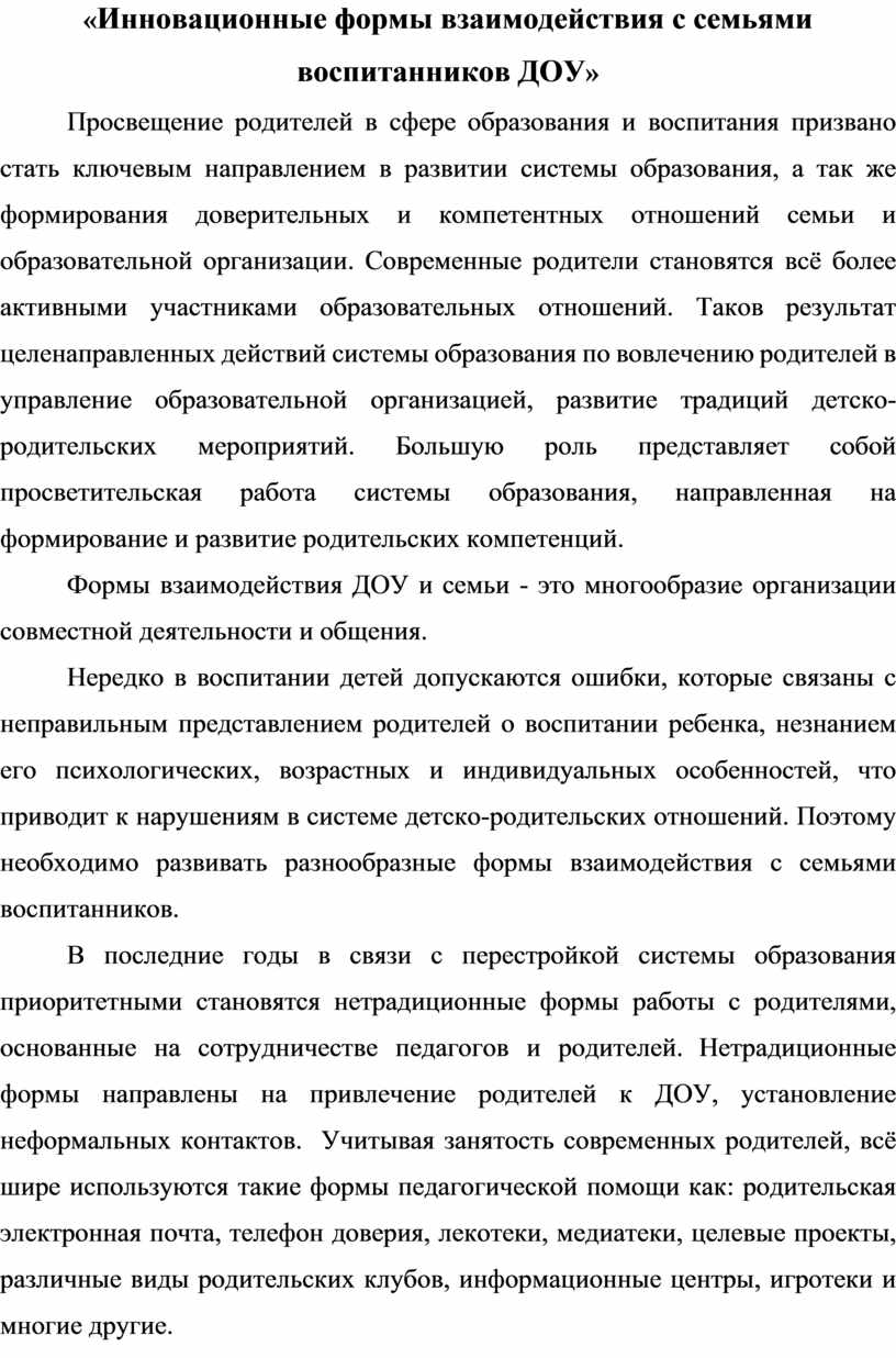В последние годы в связи с перестройкой системы образования приоритетными становятся нетрадиционные формы работы с родителями, основанные на сотрудничестве педагогов и родителей. Нетрадиционные формы направлены на привлечение родителей к ДОУ, установление неформальных контактов. Учитывая занятость современных родителей, всё шире используются такие формы педагогической помощи как: родительская электронная почта, телефон доверия, лекотеки, медиатеки, целевые проекты, различные виды родительских клубов, информационные центры, игротеки и многие другие.