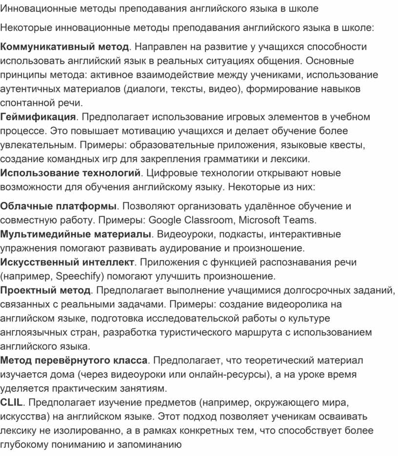 · Геймификация. Предполагает использование игровых элементов в учебном процессе. Это повышает мотивацию учащихся и делает обучение более увлекательным. Примеры: образовательные приложения, языковые квесты, создание командных игр для закрепления грамматики и лексики.