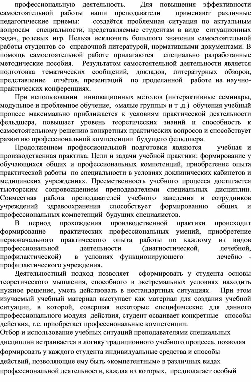 При использовании инновационных методов (интерактивные семинары, модульное и проблемное обучение, «малые группы» и т .д.) обучения учебный процесс максимально приближается к условиям практической деятельности фельдшера, повышает уровень теоретических знаний и способность к самостоятельному решению конкретных практических вопросов и способствует развитию профессиональной компетенции будущего фельдшера.