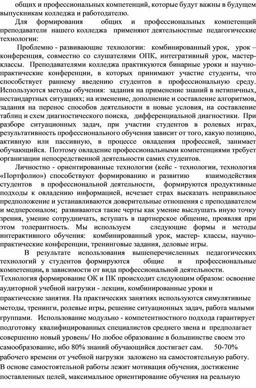 Технология формирование ОК и ПК происходит следующим образом: освоение аудиторной учебной нагрузки - лекции, комбинированные уроки и практические занятия. На практических занятиях используются симулятивные методы, тренинги, ролевые игры, решение ситуационных задач, работа малыми группами. Использование модульно - компетентностного подхода гарантирует подготовку квалифицированных специалистов среднего звена и предполагает совершенно новый уровень/ Но любое образование в большинстве своем это самообразование, ибо 80% знаний обучающийся достигает сам. 50-70% рабочего времени от учебной нагрузки заложено на самостоятельную работу. В основе самостоятельной работы лежит мотивация обучения, достижение поставленных целей, максимальное ориентирование обучения на реальную профессиональную деятельность. Для повышения эффективности самостоятельной работы наши преподаватели применяют различные педагогические приемы: создаётся проблемная ситуация по актуальным вопросам специальности, представляемые студентам в виде ситуационных задач, ролевых игр. Нельзя исключить большого значения самостоятельной работы студентов со справочной литературой, нормативными документами. В помощь самостоятельной работе прилагаются специально разработанные методические пособия. Результатом самостоятельной деятельности является подготовка тематических сообщений, докладов, литературных обзоров, представление отчётов, презентаций по проделанной работе на научно- практических конференциях.
