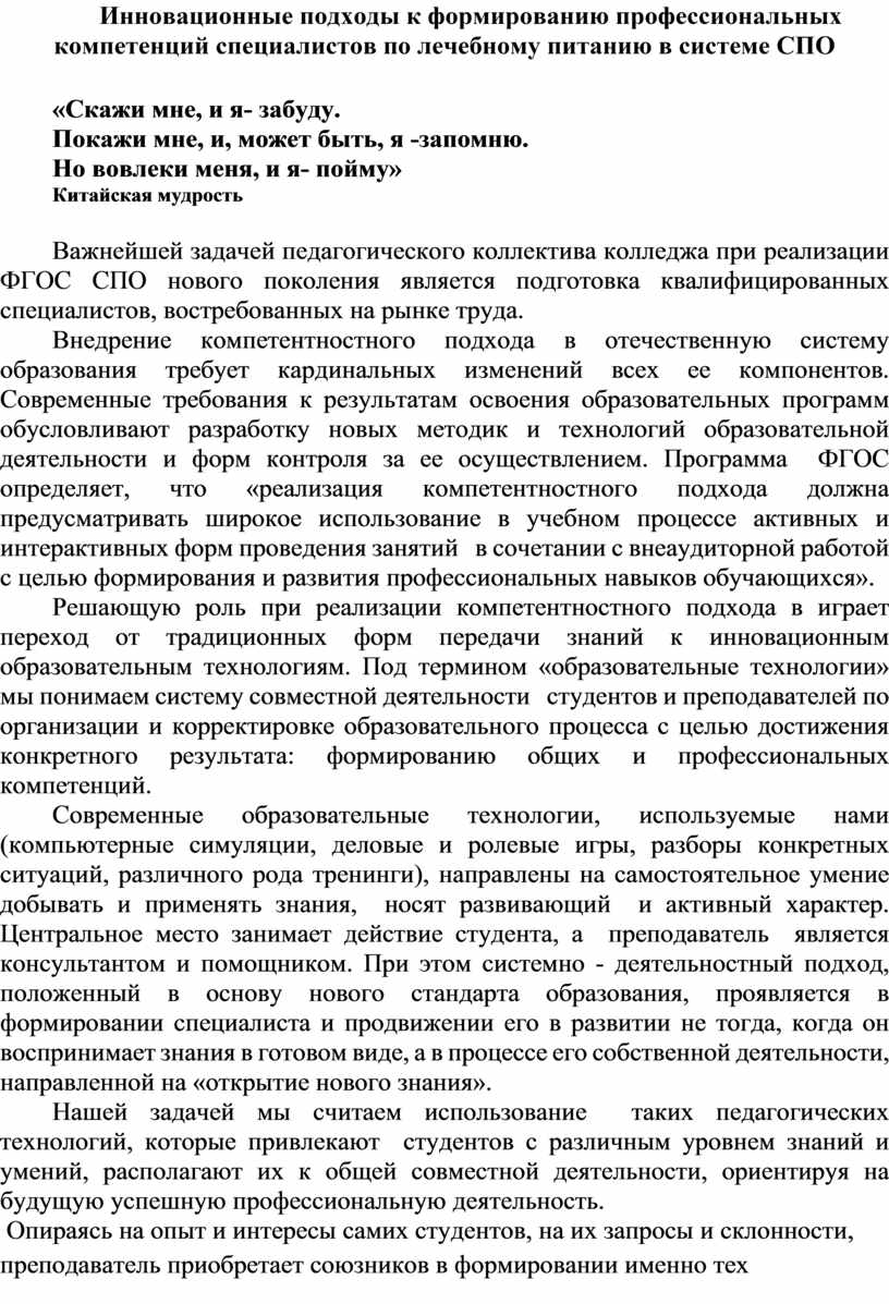 Инновационные подходы к формированию профессиональных компетенций специалистов по лечебному питанию в системе СПО