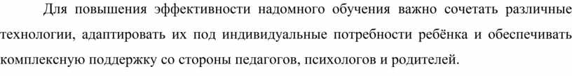 Для повышения эффективности надомного обучения важно сочетать различные технологии, адаптировать их под индивидуальные потребности ребёнка и обеспечивать комплексную поддержку со стороны педагогов, психологов и родителей.