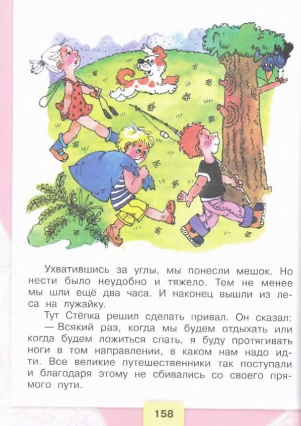 Мы пошли по дороге через лес. Впереди бежала Стёпкина собачка Тузик. За ней шёл Стёпка с громадным мешком на голове. За Стёпкой шла Лёля со скакалкой. И за Лёлей, с тремя рогатками, сачком и удочкой, шёл я.